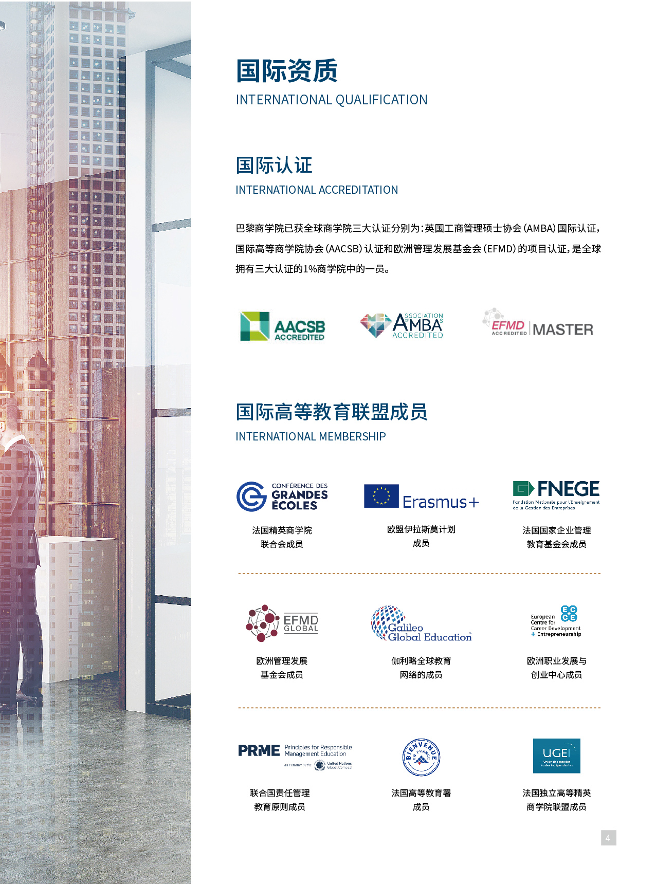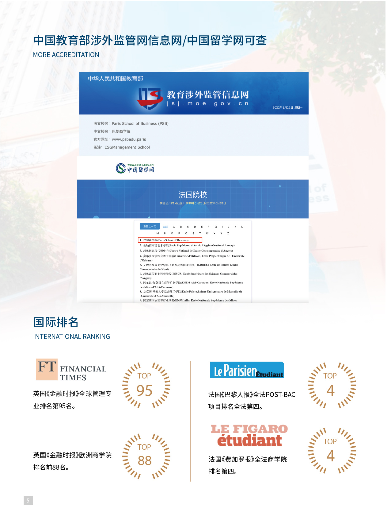 ● 欧洲百强商学院 ● 《金融时报》管理学专业世界排名第88名 ● 全球1%的三皇冠认证院校 ● 多位法国总统和政要为巴黎商学院的赞助人 ● 法国《费加罗报》全法商学院排名第4名。 ● 法国《观点报》全法商学院精英商学院排名全法第4名。 ● 法国《挑战报》全法商学院排名第6名。